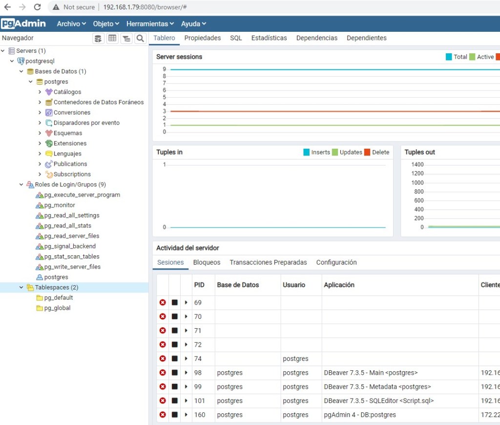 Podemos ver que los dos contenedores están arriba con sus servicios escuchando en sus respectivos puertos.Volvemos a comprobar que tanto dbeaver como pgAdmin pueden conectarse como vimos anteriormente. Cuando queramos terminar sólo tenemos que usar el siguiente comando: